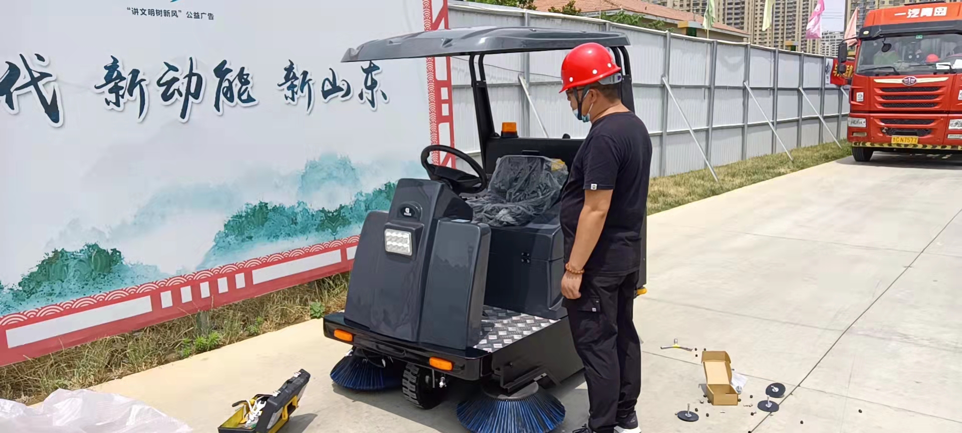 鼎潔盛世駕駛式掃地機(jī)DJ1400A.可用于的場地眾多,這次是使用在廠區(qū)內(nèi),也有很多物業(yè),和一些企事業(yè)單位以及城管之類的眾多場地,三輪的設(shè)備,垃圾箱的容量都可以適合多種場地的。清掃車是屬于三輪設(shè)備,可以原地轉(zhuǎn)彎,轉(zhuǎn)彎半徑小,靈活運(yùn)用。駕駛洗地機(jī)DJ61M,清洗寬度0.6米,洗地吸干一體,這種設(shè)備也叫做洗地吸干一體機(jī),可以清洗地面灰塵、油污等溶于水的垃圾,廣泛用于車庫、商場、學(xué)校、醫(yī)院等地區(qū)保潔,一小時(shí)大約清洗4000平方。鼎潔盛世總部派專業(yè)工程師上門送貨加培訓(xùn)。山東勝泰塑膠領(lǐng)導(dǎo)在設(shè)備驗(yàn)收現(xiàn)場對(duì)鼎潔盛世設(shè)備以及負(fù)責(zé)任的售后服務(wù)予以肯定。